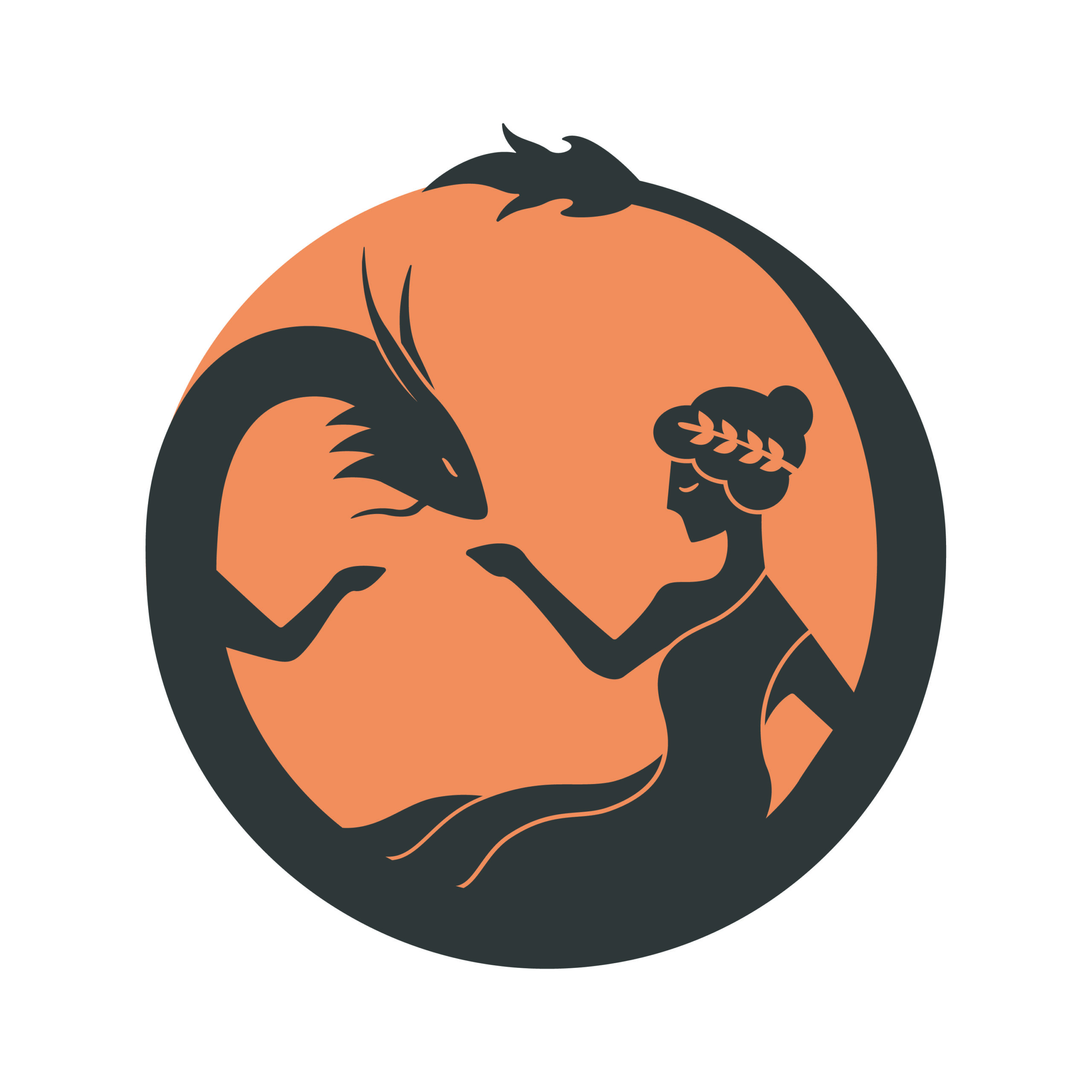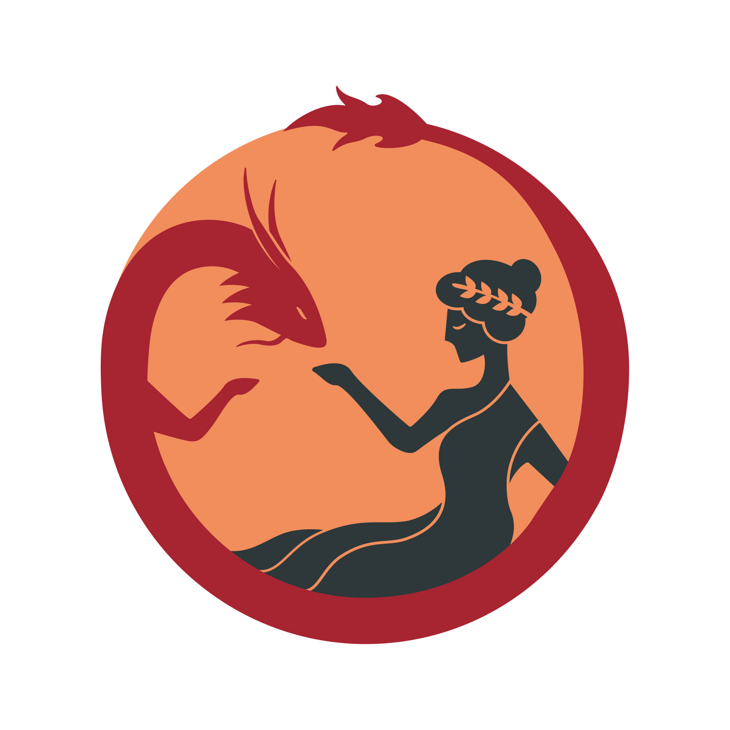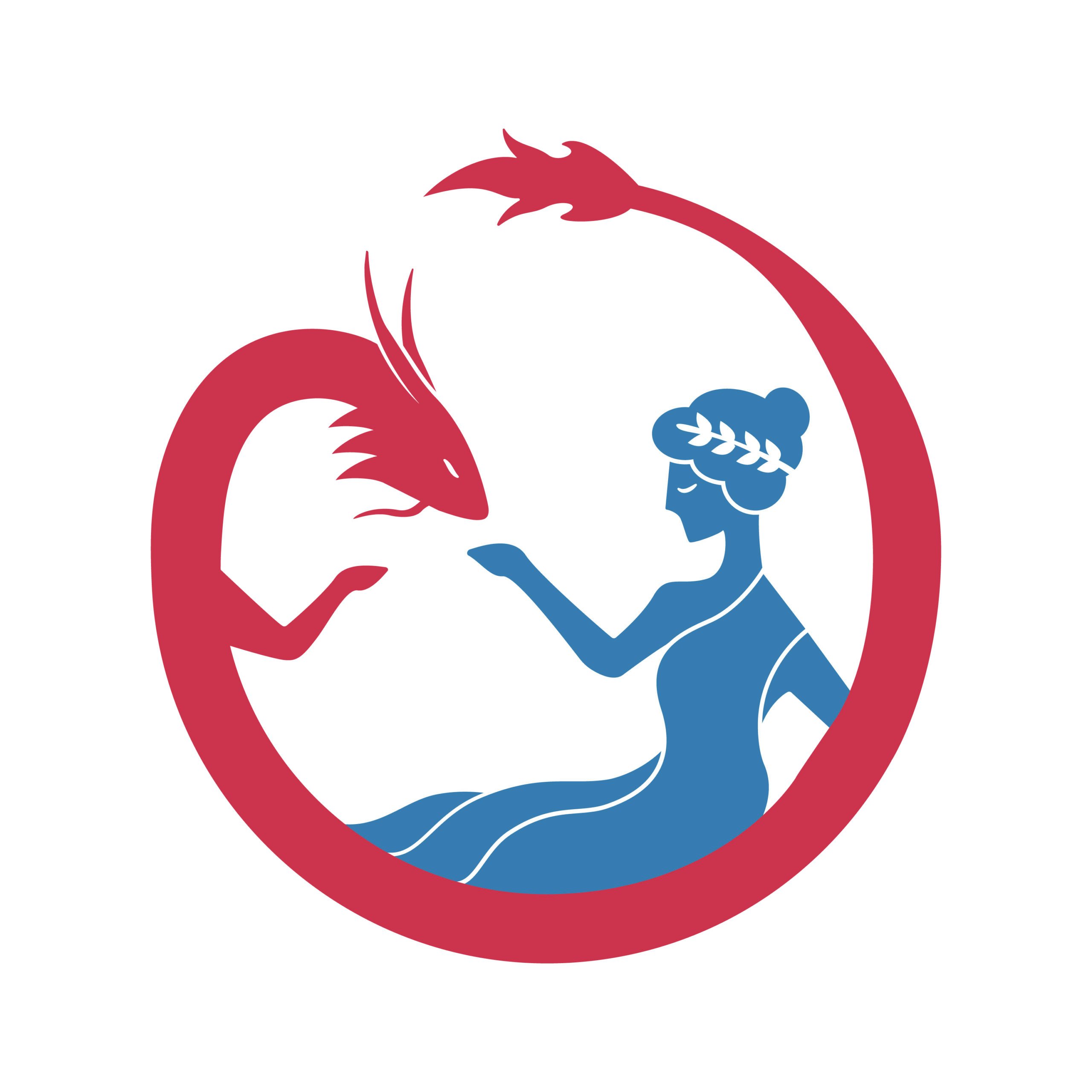 The logo depicts the cultures of China and Greece through mythological and historical symbolism (Chinese dragon, ancient Greek woman) in a circular composition expressing harmonious coexistence.